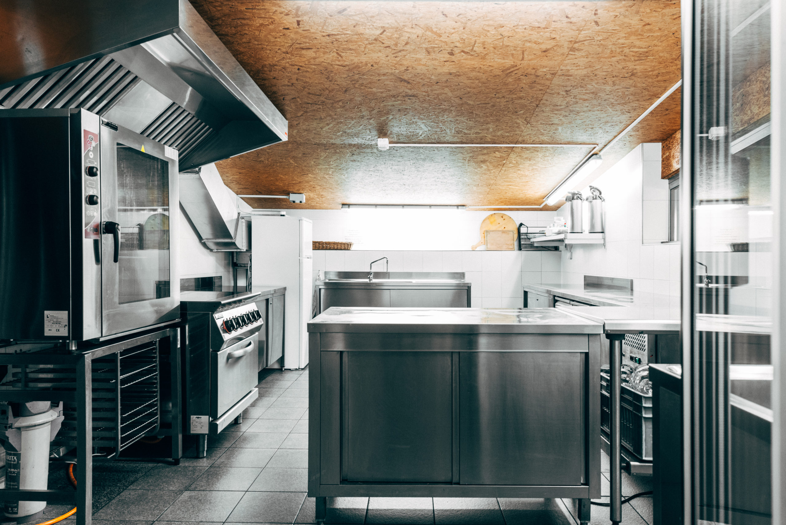 Cuisine de finition équipée d’un four à vapeur, d’un four traditionnel, de plaques vitroceram, de la vaisselle et d’une chambre froide en été.