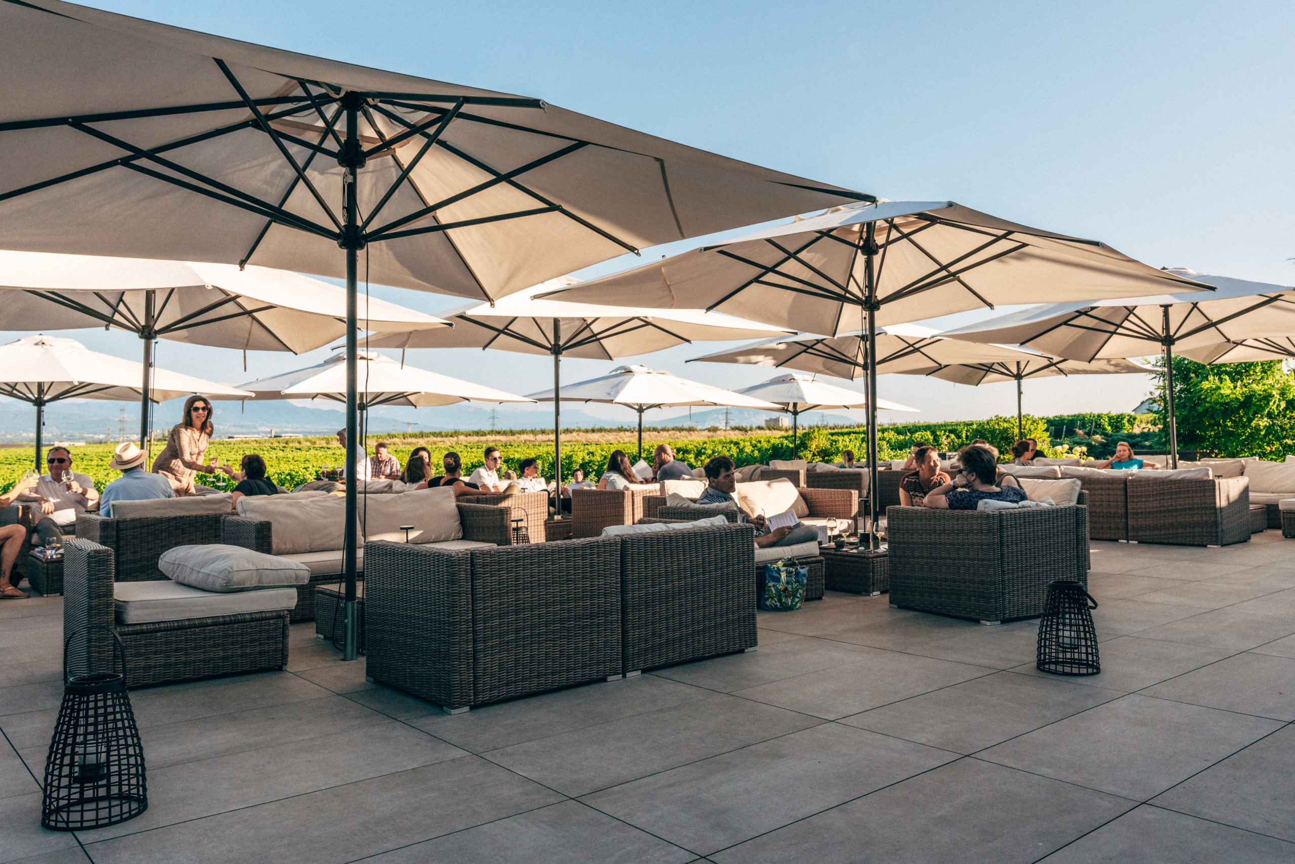 Sa terrasse adjacente de 400 m2 dotée de confortables canapés et de parasols vous accueillera pour vos cocktails et apéritifs en belle saison